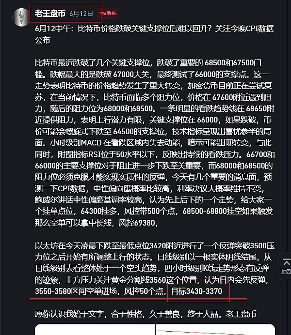 各位币友们大家好,我是老王又到了新的一周,上周直播以及给到大家的策略连续止盈四天,以太坊也是完美到达了12号预测的点位3370,刚好达到了止盈点位,目前比特币还没有到达最终点位63500,目前老王比特币空单还在持有当中,今晚8;30直播间不见不散