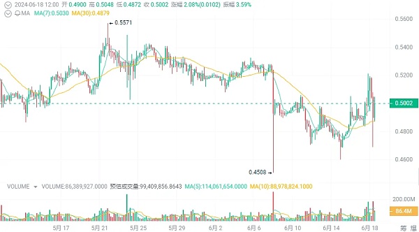 尽管整体加密货币市场呈现看跌趋势,XRP在过去24小时内逆势上涨0.58%,交易价为0.4941美元。其24小时低点和高点分别为0.4808美元和0.5194美元,显示出明显的波动性。