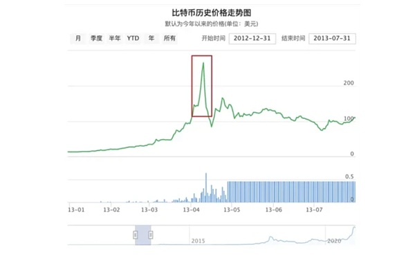 经过一年多的蛰伏,比特币在2013年2月再次突破了30美元。而在2013年,比特币的属性被发掘,被认为是一种“避险资产”。这一年,塞浦路斯爆发了严重的债务危机,导致民众对银行安全性产生了质疑。一些人发现了比特币的独特性,认为比特币或许是应对危机的不二选择。在一个多月的时间里,比特币价格从33美元上涨至235美元,但很快又回落到80美元附近。