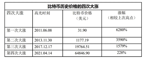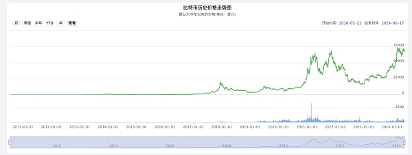 我们把时间维度拉长,以年为单位来看比特币的价格,可以看出,比特币历史价格处于上升趋势。通过观察比特币历史价格发现比特币经历了四次大涨,第一次最高涨到31.90美元,相比上次0.50美元的高点,涨幅达6280%;第二次大涨的高光时刻达到了1177.19美元,相比上次31.90美元,上涨了3590%;第三次大涨,比特币价格达到了19764.51美元,与上次高点相比,上涨了1579%;第四次牛市还在继续,我们以截至目前的最高点64846.90美元计算,跟上次最高点相比涨幅达到了228%。