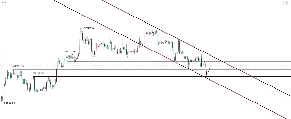 从目前行情来看依旧是处于空头排列的状态,四小时级别来看我们可以看到目前价格处于下行通道内运行,价格在早间触及上方67200压力位形成下跌在下方64500附近受助,出现短幅度反弹,日内交易依旧还是看空为主,但是目前点位并不是很理想,依旧需要看一波反弹选择高位入场空单,或者在下方入场多单