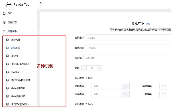 以上只是让大家选择创建标准代币,事实上还可以选择其他不同的代币机制,例如314协议、分红本币、LP分红、Mint+持币暴力分红等