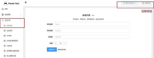 简单来说,这是一种可以让用户自主在BSC发币的工具。只需要填写几个参数信息,轻轻敲击几下键盘,就能将代币创建到区块链上。而这个工具会在你发币的时候收取一点费用作为服务费,从而保证其可以正常运营与持续开发。从市场来看,较为知名的一键发币平台主要有:PandaTool、DEXLAB、Ceatemytoken等等。不过他们几个也有侧重,DEXLAB专注于Solana链发币,PandaTool和Ceatemytoken则是全链发币,对BSC的支持度更好。但不管是兼容多少链,他们本质上都提供了一个可视化的页面,让用户可以更加便捷地发行代币。