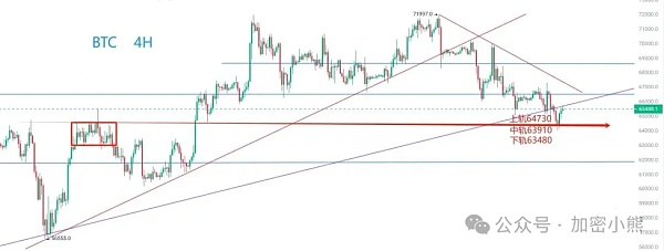 比特币昨日在进入4小时震荡区间的上轨区域后,出现了止跌小反弹。目前的盘面显示,这是跌破日线上行趋势线后的第一次回抽,小时线持续底背离,短期内大跌的概率较低。短线抢反弹的点位可以在上轨64730进场,补仓区间则放在中下轨63910~63480(1:2)。目前代表中短线行情的均线系统并没有表现出持续进攻的态势,加上背离结构,暂时在底部震荡的概率较大。