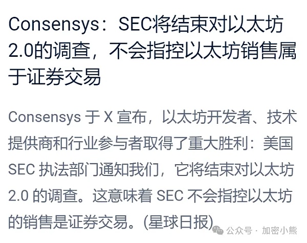 美国证券交易委员会(SEC)正在结束对 Ethereum 2.0 的调查。这意味着 SEC 不会提出指控称 ETH 的销售是证券交易。这就意味着以太坊摆脱了SEC的刁难,今后可以不用再看SEC的脸色,这条消息一出,以太坊生态的Restaking赛道率先拉盘,接下来可以重点关注以太坊生态了,即将到来的利好会更多