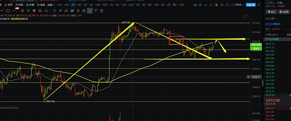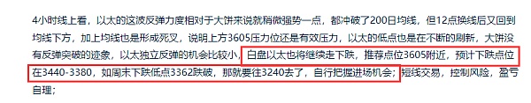 4小时线上看,以太拉升的力度稍微强一点,以太这波下跌也是到了前面一波拉升的50%位置,两次到达没有破位,随后走出反弹,以太白盘上方压力是3705附近,上方有200日均线,前面在这个地方是给到了一定压力,行情在底部一直震荡,没有反弹,随后走出下跌,以太要去突破3705压力还需要很大的力量,短线在试探压力后还是会走出下跌,推荐点位3700附近收针可布局,目标看3540-3400位置,随后看3400位置能不能有效破位,破位就会往3260附近去了,自行把握进场机会;短线交易,控制风险,盈亏自理;