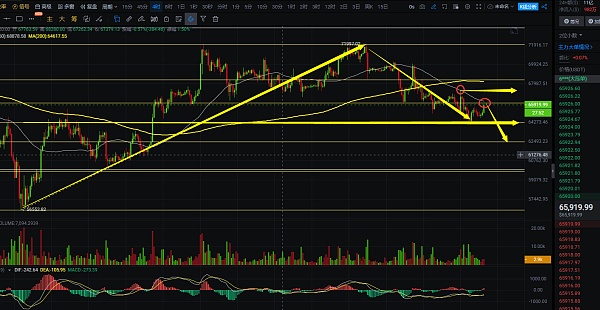 4小时线上看,目前大饼的下跌走到了前面一波反弹的50%,但下跌还没有结束,结合市场上情况来说,现货ETF的不断流出,对于市场来说不算很好的消息,技术面上看,大饼的低点在不断地刷新,反弹也没有去突破短线的高点,白盘反弹后行情依旧是下跌机会更大,打破67300位置,那就可能是打破下跌要走一波反弹,白盘交易上方还是有一定的压力,可围绕压力去做轻仓布局,然后看突破情况,大饼推荐点位66100附近,该位置收针可布局,突破67300就没有持有必要了,目标看64300,前面下跌低点64030跌破,可看到62500附近,自行把握进场机会;短线交易,控制风险,盈亏自理;