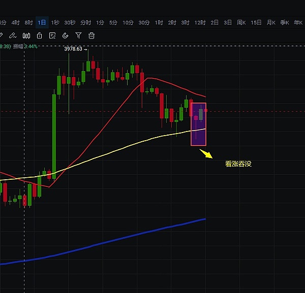 昨日以太坊3843.11开盘,3560收盘,高3588,低3465.38,涨幅2.21%。从数据看以太坊虽然以阳线收盘,但是一路震荡上涨(和我昨天预测结果一样),上方3560和3650压力不小。而且昨日阳线和前日k线形成了看涨吞没,预测今天行情还会艰难上走,但是能否突破上方压力位有待观察,从成交量看能量不足,笔者认为突破3650可能需要一段时间。