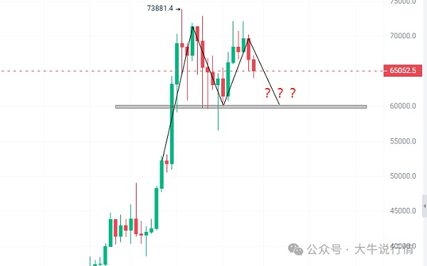 一直是看涨的思路,但上涨期也有深度调整的过程,目前是4小时级别的双顶调整过程中,颈线就在67000,昨天强势反弹测试颈线,诱多后延续震荡下行,按照双顶理论跌幅,这次回踩的点位在62000附近,这正好是日线级别回调的0.618位置,也是多头强势买入的点位,值得留意,另外最重要的多头支撑依旧在60000,多次验证的订单墙。