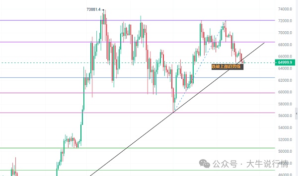 一来因为目前没有明显的顶部确认信号,二来,减半后的行情还没有到来,不过需要警惕一波杀多后终极拉升,日线上表现较为明确,目前已经跌破了27000以来的上涨趋势线,在价格没有完全站上趋势线之前,整体都是偏弱向下调整的,突破67000才会进入强势,位置也不太符合直接反转,所以近期以弱势调整为主,但不适宜追空。
