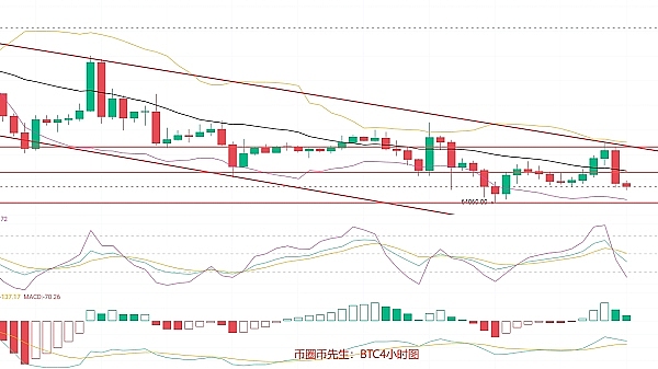 当下从技术面来看,日线级别MA5均线依旧是下行的趋势,MACD空头量能维持不变,不过KDJ三线粘合有底背离的迹象,单从日线级别来看,整体还是一个震荡下行的轨迹。从小时线上看,目前未触及下轨的,布林带呈开口状态,币价也是受到下轨支撑持续震荡但并没出现大幅反弹,凌晨至日间关注下方64200的支撑,上方关注65300的压力位,晚间行情大家还是高位做空为主的思路,