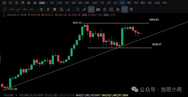以太坊的走势与比特币完全不同,盘面传达的信息也截然不同。