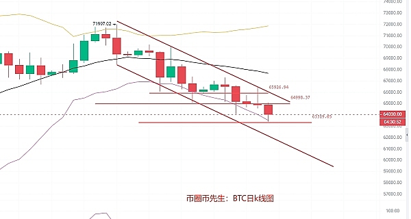 比特币日内反弹力度减弱,短周期上方压制在缓慢拿下移,后若是不能突破65000-65200压制区域,预计价格还将走低。目前走势承压已经到了63000一线支撑,日线图五连阴,空头情绪偏强,所以操作建议关注63850支撑强度,多单暂时不要入场,跌破顺势跟进空单,目标看到63500-63200-63000。若是再度63000一线,空单继续跟进,短线看个300-500点即可。