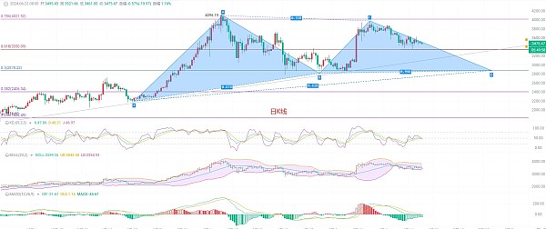 四小时K线横盘修复一直在3500关口徘徊,EMA收缩趋势比较常见,我们只要做好一个等字就可以了,KDJ向下受阻3450支撑点,布林带收缩说明新的拐点即将出现,下轨支撑3470已经跌破了,上轨压力位也给到了3535,MACD缩量下行,整体的趋势依旧是空,什么位置空很关键,我们要做的是等机会等信号,等入场点,