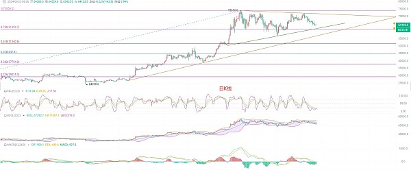 这种震荡下行的持续的时间已经很久了,从六月七号一直到现在,临近月末,行情一直在64000关口附近徘徊,截止发稿前凌晨两点,日K线在EMA90趋势指标压力位65000下方受阻,KDJ收缩K线背离,布林带开口,多空距离拉开,K线离开了下轨支撑62700,中轨压力位关注67300.整体趋势盘整,MACD缩量增筹K线同样背离,这种底部背离不一定是反转信号,预计主力会有一波探底以后得拉伸,关注下方大趋势支撑点61300附近