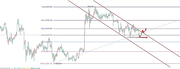 以太坊行情依旧处在空头排列,上周触及下行通道下边界并未形成突破,再次受压向下。从目前以太的行情来看其实是币大饼走的稍微强势点,我们可以用看到前期以太是有去突破我们下行通道,但是并未企稳再次收回,但是收回过后又多次在去尝试突破,目前从斐波那契来看以太并未跌破斐波那契多空分割线,还是处于0.5附近,目前关键位置还是要看3400这一线位置能不能够实体跌破站稳,没有跌破那么就是走反弹了,即使跌破那么下方3360附近还存在支撑位,所以下方空间并不是很大,性价比的角度来讲还是回踩做多比较合适,总结目前的整体情况思路上还是回踩去做多。