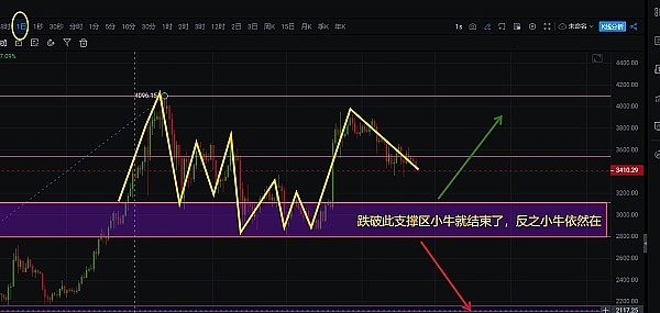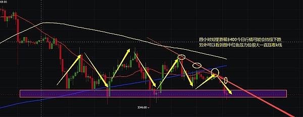 四小时级别3400附近支撑很顽强,不过上一个四小时k线实体已经插入支撑区,如果今日跌破毫无疑问空