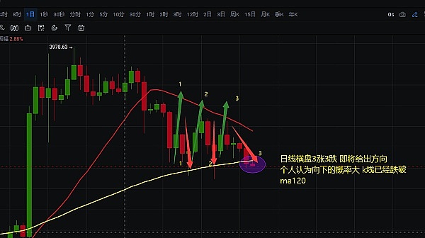 好了咱们回顾昨天姨太日线,昨天收了跟标准的阴线,上影线略大于下影线,所以今日开盘已经跌破ma120均线,日内看空。另外从斐波那契来看,只要不跌破我画的支撑区域,小牛依然存在。不过笔者认为接下来的行情很可能走低,逼近斐波那契的支撑区。因为大饼还是那句老话可能会暴跌。姨太再有个性也会受到大饼影响。另外姨太日线级别横盘震荡已经完成三涨三跌,即将给出方向。