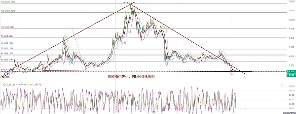 FIL日线级别四连阴,空头情绪逐渐浓重,且区间在不断下移,目前支撑在4一线,后续若是跌破企稳,行情有回撤4一线的可能,所以破位可以把握短空,短期上方压制关注4.7附近,给到机会空单入场,止损4.8,