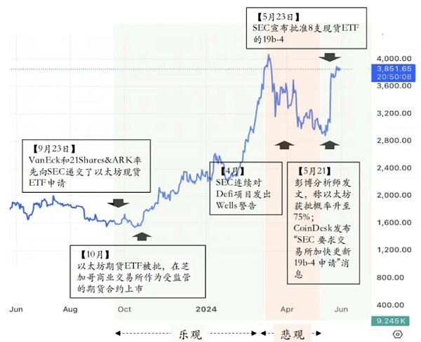 5月21日,彭博分析师的乐观预测点燃了市场的热情。随后,SEC于5月23日宣布批准8支现货ETF的19b-4申请,以太坊价格应声上涨超20%,市场情绪迅速反转。