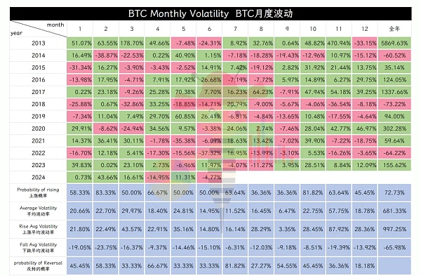 历史上的7月,大饼上涨的概率是63.64%,7月也许是因为年中的原因,我们能看见,7月是相对于上个月反转概率最高的月份。第三,6-7月没有反转的两次分别是2015年和2017年,都是连续上涨。也就是说,BTC从来没有过6-7月连跌两个月的历史。当然,只有十一、二年的样本,数据的说服力也比较有限。