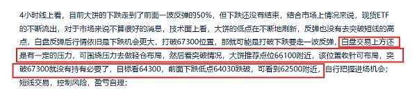 前面我们预计行情还要继续下跌,这波下跌截止到昨日才走到位,大饼下跌最低点位在58400位置,我们前面布局的66100的空,不说抓到58400,就抓到目标62500,也有3600点左右的利润,以太下跌低点是3240,基本到达我们预测目标3260附近,3700附近的空到3260位置,利润400点左右,恭喜跟上战神这波布局的朋友小赚一波;目前行情下跌后,抄底机会来了,这波下跌回调到位了,注意把握;