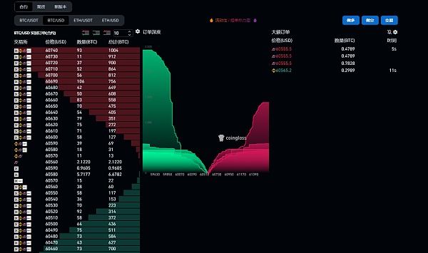 订单簿 :在59,500至58,600美元之间有大量的买单,而在60,000至61,000美元之间有大量的卖单。