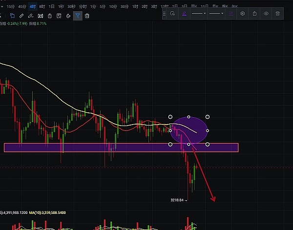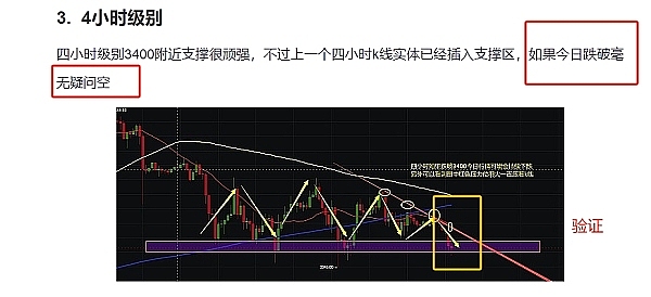 昨日行情再次验证了昨天的预测跌破了四小时我画的支撑区,来了个大跌插针。