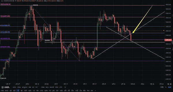 再看当前日线级别大饼下行突破EMA150,但是还在防守日线19号低点;而以太却有意在形成插针回撤EMA120现象,那么就可以考虑此处轻多反弹;还是那句话短多不易久拿!大趋势空并未缓解,可继续考虑在日线级别反弹EMA80位置左右空!