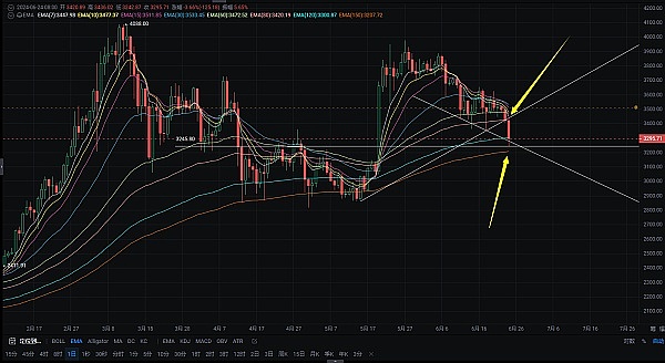 近日的行情实在很好做,历辉一直都是布局的高空操作,除了行情波动不大需要耐心点,其实很容易见到收米的,但有一点不知道大家注意没,就是历辉一直没有布局多?这是为什么,历辉前面文章也多次强调牛市尾巴做空空间更大,因为市场也不可能一直走牛,砸盘的可能也许就可能出现在任何一个多头热潮中!今日行情足以证明历辉的设想,前日SOL现价134.5空单长线布局,今日立竿见影就见到收米了,也说到比特币日线会跌至EMA150处,你看这不就到了吗,SOL已入场的币友们可以减仓持有!先可以拿一部分收米!再看以太昨日还在EMA80,今天就直接下行刺破EMA120直逼EMA150,所以你要说他涨的快,但跌起来也快!以太坊昨日也讲过跌破3420-3400就会到EMA120位置;