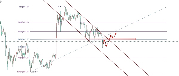 四小时级别中我们可以看到目前以太行情依旧处于空头趋势,从整个K线的形态来看目前是走下行通道的结构,从斐波那契来看目前以太依旧跌破50%关键位,触及下方0.618出现反弹向上,目前反弹触及上方0.5附近形成压制并未突破空头结构,目前上方依旧需要关注3400附近压制,做多的话可能要等待行情二次测试下方能否形成双重底部才是我们考虑做多的机会。目前依旧会考虑在3400附近入场空头。