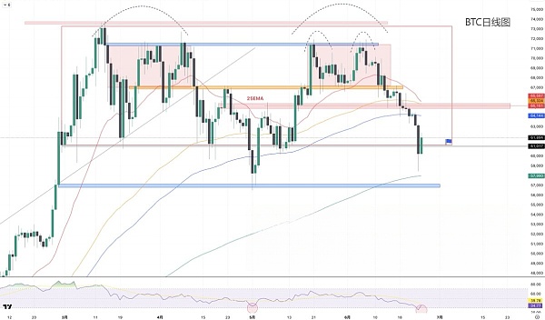 日线图上双顶形态的确立导致价格继续下跌,目前币价已经跌破了区间方支撑61,000美元,可能会进一步下跌。