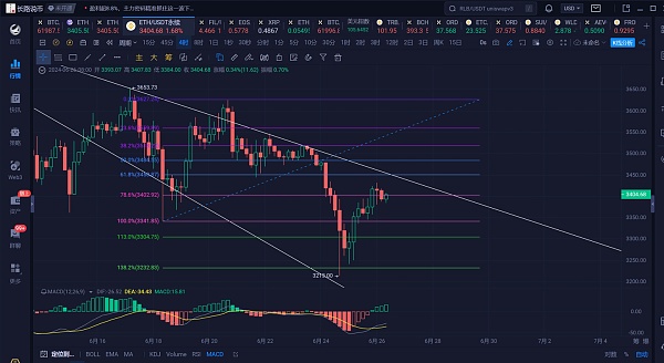 以太坊上个交易日从凌晨的3300附近连续反弹,凌晨最高涨至3230附近承压回落,早间跌至3385附近获得支撑反弹,现行情位于3400附近震荡。