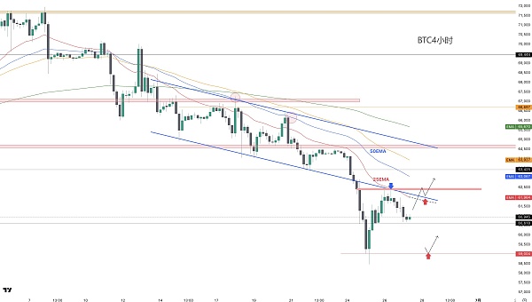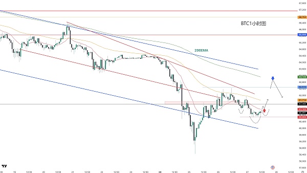 1小时图上可以看到近期在60,600美元附近形成了底部的短期支撑,因此只要不跌破此区域,就可以在短期内寻找做多点位。