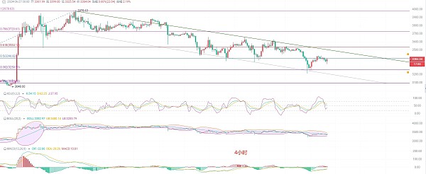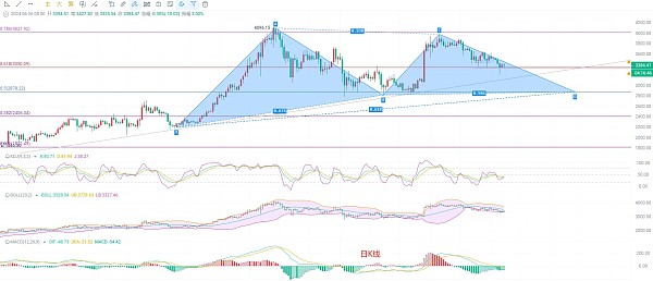 四小时K线可以看到上方EMA压力位在3520附近,那么短线回调上方空间还有一百多点,KDJ虽然向下扳回形成死叉扩散趋势,但是有很强的阻力,布林带收缩,四小时K线跌破中轨以后回到中轨,上方压力位关注3480,下方支撑防守3285,MACD放量增筹持续底部背离很强,空势反转多的概率变大,DIF和DEA低位向上扩散,那么思路上短多持续不变