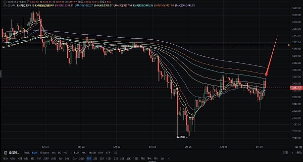 以太当前1小时级别来看凌晨在下行插针3325后形成反弹至当前EMA120后再次形成回落,从KDJ三线来看已经在顶部开始拐头;DIF与DEA低位收口重合可能会再次形成背离,布林带通道开口,说明日内行情波动较大;