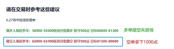 昨日师爷文章中在62000-62400区间预埋做空,行情在晚间10点最高涨至62379附近。随后最低跌至61341,文章中空单目标61300精准到达,预埋空单拿下1000点利润。