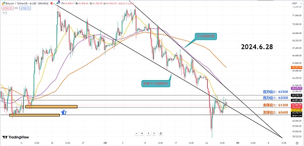 而在60.6K位置得到支撑后反弹,所以可以暂时将支撑区上调至61.3K来应对,并将其设为盈亏比的区间。