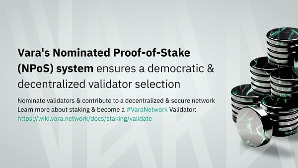 Vara 的共识模型是 Nominated Proof-of-Stake (NPoS)共识机制——该机制提供了改进 Vara 网络可靠性的验证优势。在这种模型中,提名者以被动的方式参与,他们质押代币并选择可靠的验证者来维护和保护区块链。通过选择可靠的验证者,提名者间接地为网络的健康发展做出了贡献。