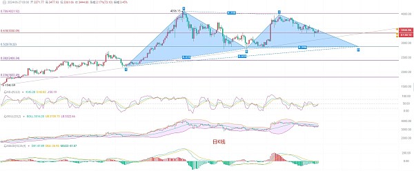 来看今日盘口,以太坊发稿前零点三十分,现价3445附近,日K线最高3475附近,最低3360附近,整体趋势出现U形趋势,不排除搬回到3600的可能,所以不要急着开仓,EMA整体趋势依旧是空,日K线受阻EMA15和30交叉点3475,KDJ向上形成金叉,布林带向下收口,日K线从下轨3330拉伸到了中轨压力位3515的下方,上轨关注3710,MACD缩量增筹,DIF和DEA低位开始收缩,短线趋势偏多为主,但是大趋势空还没有扳回,依旧是空势,就看月末这几天能否扳回,