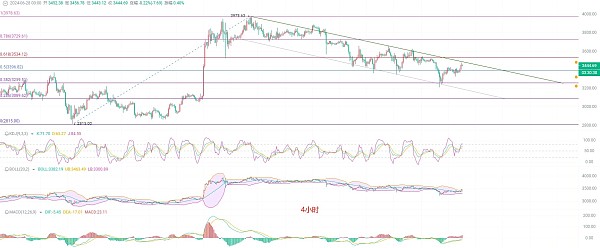 四小时K线连续收阳线,破了EMA60压力位3450,目前位于3450附近盘整,KDJ向上扩散,布林带收缩以后K线破了布林带上轨3465压力位,MACD放量增筹上行扩散,DIF和DEA开始冲击0轴线,思路上压力位受阻以后布局空,支撑位附近布局多
