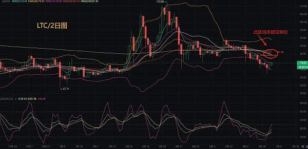 LTC莱特币日内也比较强势其它小币种,走势上行至74.18位置承压,短线这波反弹暂缓了回调节奏,但是日内若是不能突破日线中轨75.5压制,预计下行还将延续,短期有试探75.5位置的可能,所以破位看站稳情况,上方关键压制关注79.5区域,后续反弹此区域给到机会空单可以轻仓考虑,破位及止损,止盈看72.5位置附近。