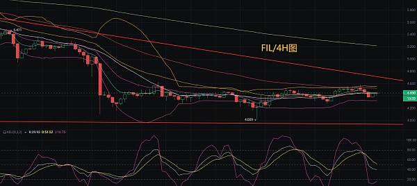 FIL日线级别来看短线走势处于弱势盘整,区间在不断下移,后续重点关注4.6 -4.75区域压制,没有出现强势反弹突破之前,震荡下行格局不变,所以谨防价格持续走低。下方重点关注4.1一线支撑,破位跌势有进一步下探的可能,望各位提前做好准备,跌破可以顺势考虑短线空单。