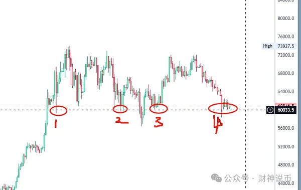 大饼现在60000附近徘徊,在最近的四个月里,这里有过4次大的触及,但这一点明显与前三次不一样了。前三次,多头的抵抗都非常坚决而快速,但这一次,多军的抵搞似乎变的弱了许多。如果60000失守,那么未来就要进入5时代了。