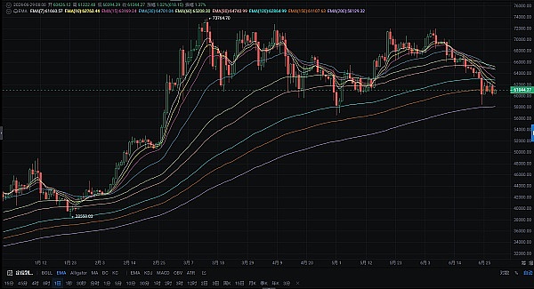 日线级别布林带通道继续下移,币价当前冲击EMA150,但上方EMA15依旧下行靠拢EMA120,EMA30在下行穿过EAM80继续下移,DIF与DEA在负值状态继续下行,并没有明显的拐头或收口现象;短期空势依旧存在;
