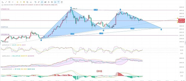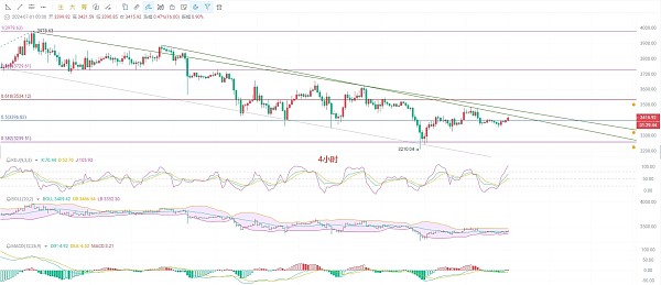 三线收官在即,截止发稿前凌晨三点,以太坊现价3420附近,日K线周线和日K线三线都有小范围回调,但是距离上方趋势压力位3520附近还有一段距离,暂时可以看做回调,前面说的趋势不调不做,毕竟大趋势依旧是空,上方第一压力位关注EMA60的压力点3460附近破位看3500,KDJ向上开口,布林带向下收口两大指标背离,MACD缩量增筹,DIF和DEA低位收缩,短线有回调长线不破压力位依旧是空