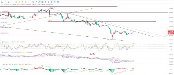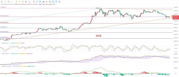 截止发稿前凌晨三点多比特币现价61800附近,日K线扳回到了周线压力位62000附近受阻,说明短期内想要破62500还有一定的难度,毕竟EMA趋势指标网状向下交替扩散的动能很强,多头想要扳回并不是想象中的容易,KDJ上行扩散开口以后布林带向下收缩,K线离开下轨支撑开始 向上冲击,MACD缩量增筹第6天,这一波增筹六天行情背离没有上行,多头一直在积攒动能,至于能否爆发这一波动能冲到63300上方拭目以待
