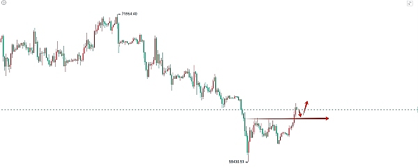 比特币多头发力最高来到63800附近,四小时级别来看比特币在上周并没有去回踩下方低点,而是在60000上方止跌向上,突破上方62500附近压力位,从目前的盘面中多头有具备反转的信号但是并未形成明确的反转,需要等待行情去回踩下方压力位没有跌破,才能确定是多头信号。