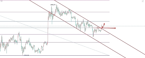 四小时级别来看以太在前期一直是走下行通道运行,今日早间多头发力突破下行通道,目前以太已经站上黄金分割0.5上方,但是并不能确定是明确的多头型号,需要等待行情出现回踩测试下方没有跌破3450附近,才是明确的企稳信号,从目前整体的K线以及趋势来看行情是偏向多头了,操作上考虑回踩接多。