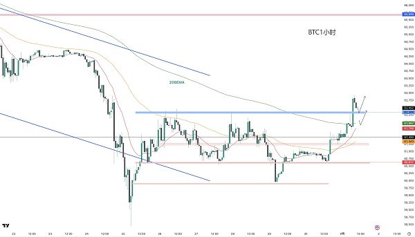 以1小时图的25EMA和200EMA作为支撑进行做多,做多价格62,000美元。
